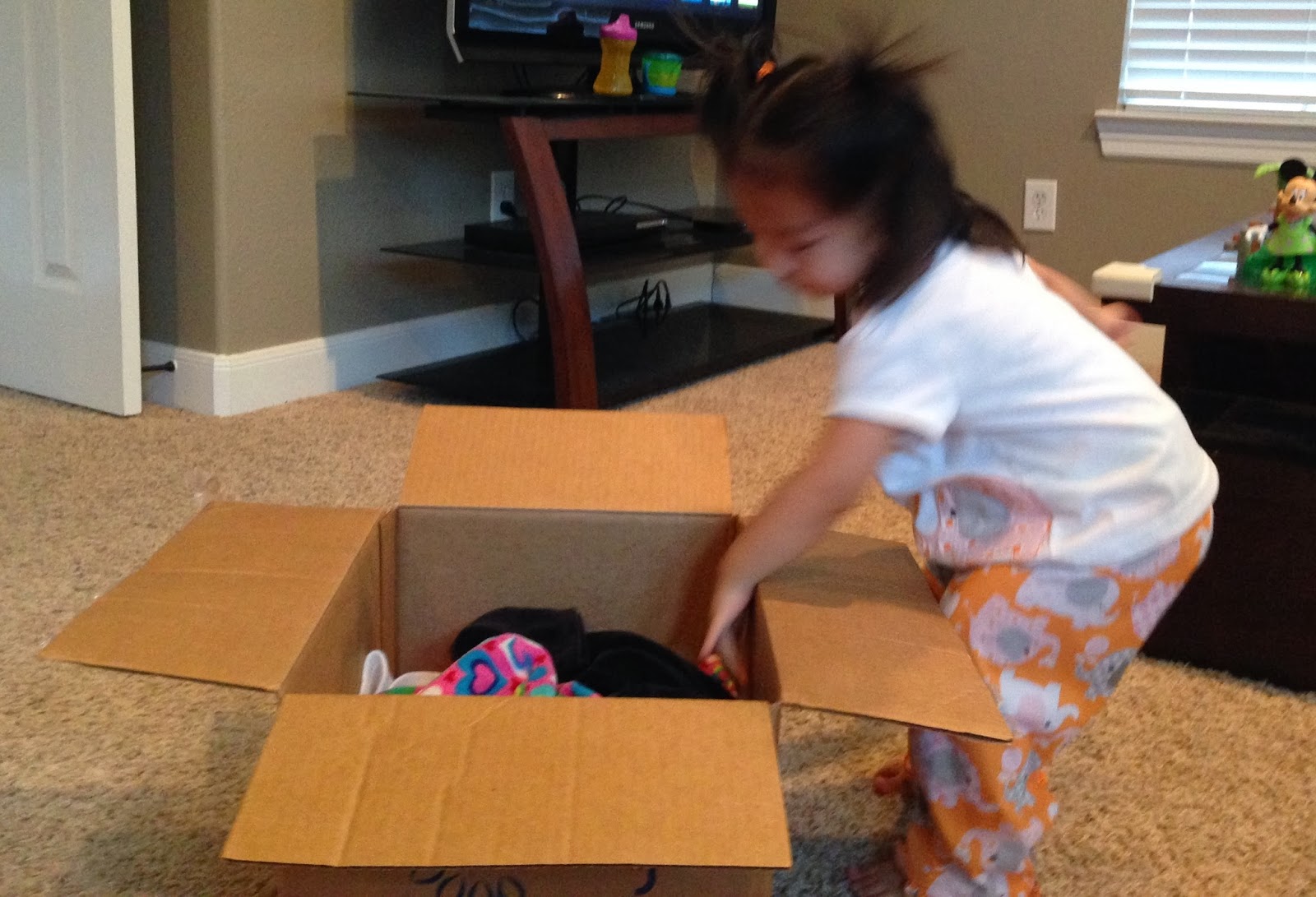 - Allow your children to choose a family gift. There are a lot of ways to do this and you can make it look however you want, but if your kids are old enough, let them take the lead. Have them do research and come up with something they can do for someone else, whether it's an organization, a local family, a ministry, whatever their little hearts are drawn to. If it's something they want to donate to, then let them figure out how to earn some money and help them take/send that money. If it's buying gifts for a local family in need, it's always nice if the kids can actually pick out, wrap and give the presents to the family. Don't write off doing this with your kids if they're still young. Mine are both 2 but helped me pick out clothes and toys to send to Zoe's orphanage in China. We even had a full discussion about where the box was going and who was getting the present. They were very excited to help me pack the box, after they made sure the toys were good, of course.Zoe packing the box.